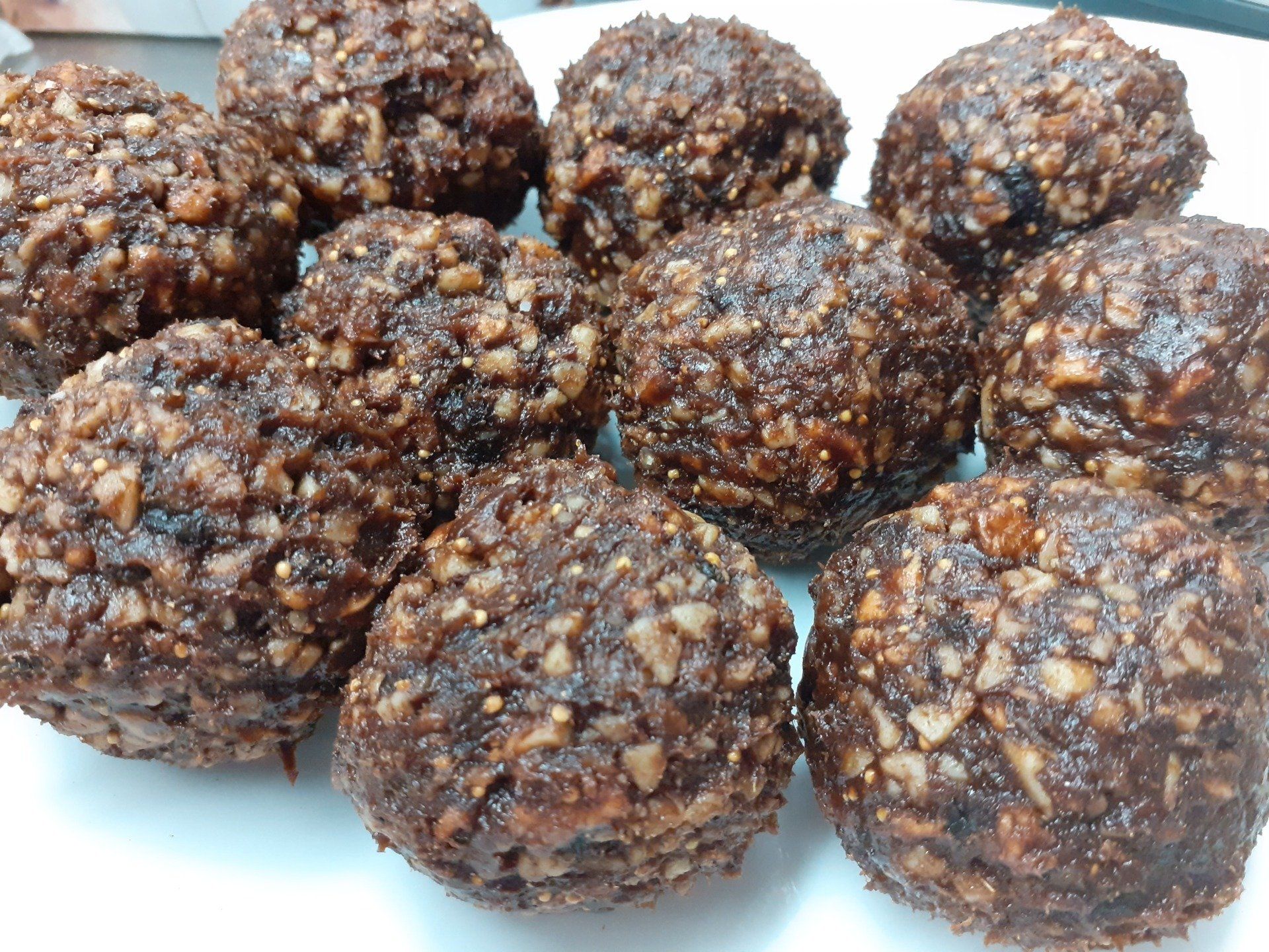 aus Nüssen, Schokolade, Agavendicksaft geknetet, portioniert und handgerollt ...